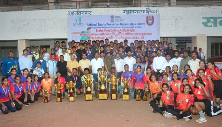 नगर (प्रतिनिधी)- शहरातील वाडियापार्क क्रीडा संकुल येथे स्टेअर्स फाउंडेशन व अहिल्यानगर जिल्हा क्रीडा कार्यालय यांच्या संयुक्त विद्यमाने आयोजित आंतर शालेय फुटबॉल स्पर्धेत 14 व 17 वर्षे वयोगटातील मुलांच्या संघात आठरे पाटील स्कूलने विजेतेपद पटकावून चॅम्पियन चषकावर नाव कोरले. विजयी संघाच्या खेळाडूंनी मैदानावर एकच जल्लोष केला होता. तर 17 वर्षा आतील मुलींच्या संघात श्री साई इंग्लिश मीडियम स्कूलने विजेतेपद पटकाविले.