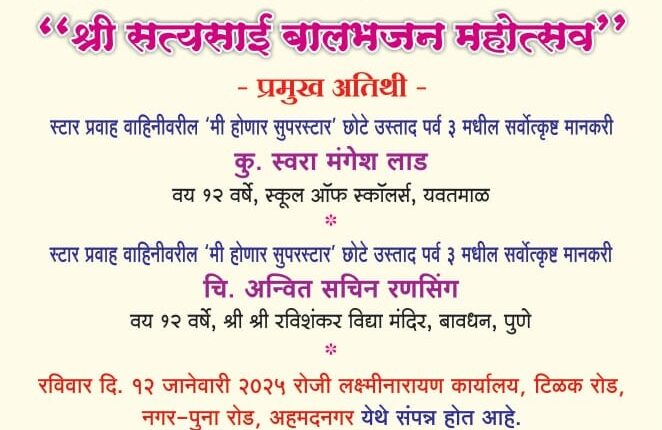 नगर – बालगायक/वादकामध्ये अध्यात्मिक धार्मिक संस्कार रुजावेत, संगीत साधनेच्या त्यांच्या आवडीला प्रोत्साहन मिळावे या हेतूने यत्या रविवारी दि.12 जानेवारी रोजी सकाळी 9 ते दुपारी 4 या वेळात टिळकरोड वरील लक्ष्मीनारायण कार्यालयात 15 वे राज्यस्तरीय श्री.सत्यसाई बालभजन महोत्सव संपन्न होत असल्याची माहिती संयोजक अशोक कुरापाटी यांनी दिली.