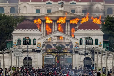 संतप्त जमावाने अनेक मंत्री, खासदार, अगदी माजी पंतप्रधानांच्या घरांवरही हल्ला करून जाळपोळ केली ![🏚️]()