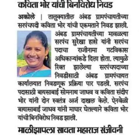 अकोले तालुका | ग्रामपंचायत अपडेट अंबड ग्रामपंचायतीत नवा नेतृत्व बदल — कविता संदीप भोर यांचा सरपंचपदी एकमताने नवा अध्याय सुरू! माजी सरपंच सुरेखा हासे यांच्या राजीनाम्यानंतर झालेल्या निवडणुकीत कविता भोर यांच्या विरोधात अर्ज दाखल केलेल्या बायसाबाई जाधव यांनी माघार घेतली, आणि कविता भोर यांचा बिनविरोध विजय निश्चित झाला!