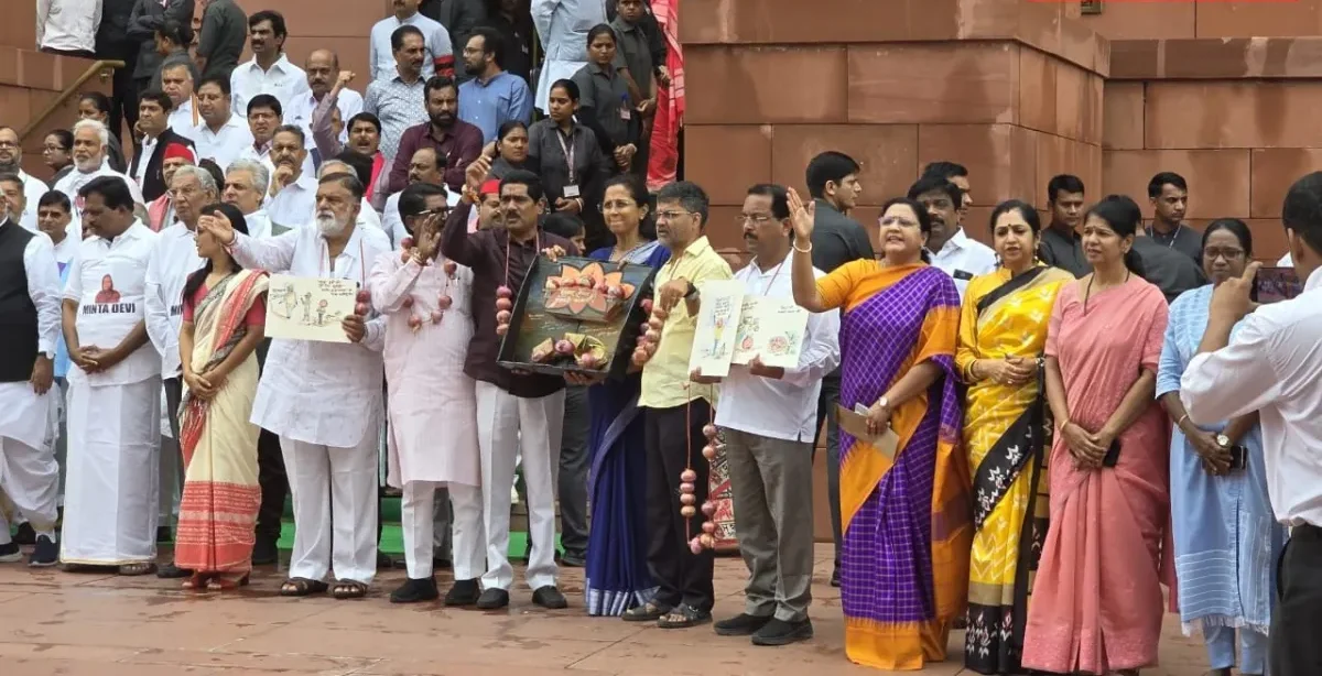 खासदारांनी गळ्यात कांद्याच्या माळा घालून थेट सरकारला टोला – “शेतकरी कोमात, सरकार जोमात!”