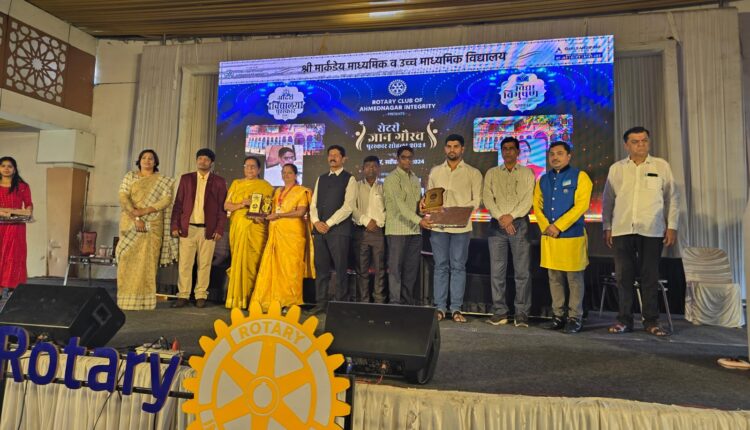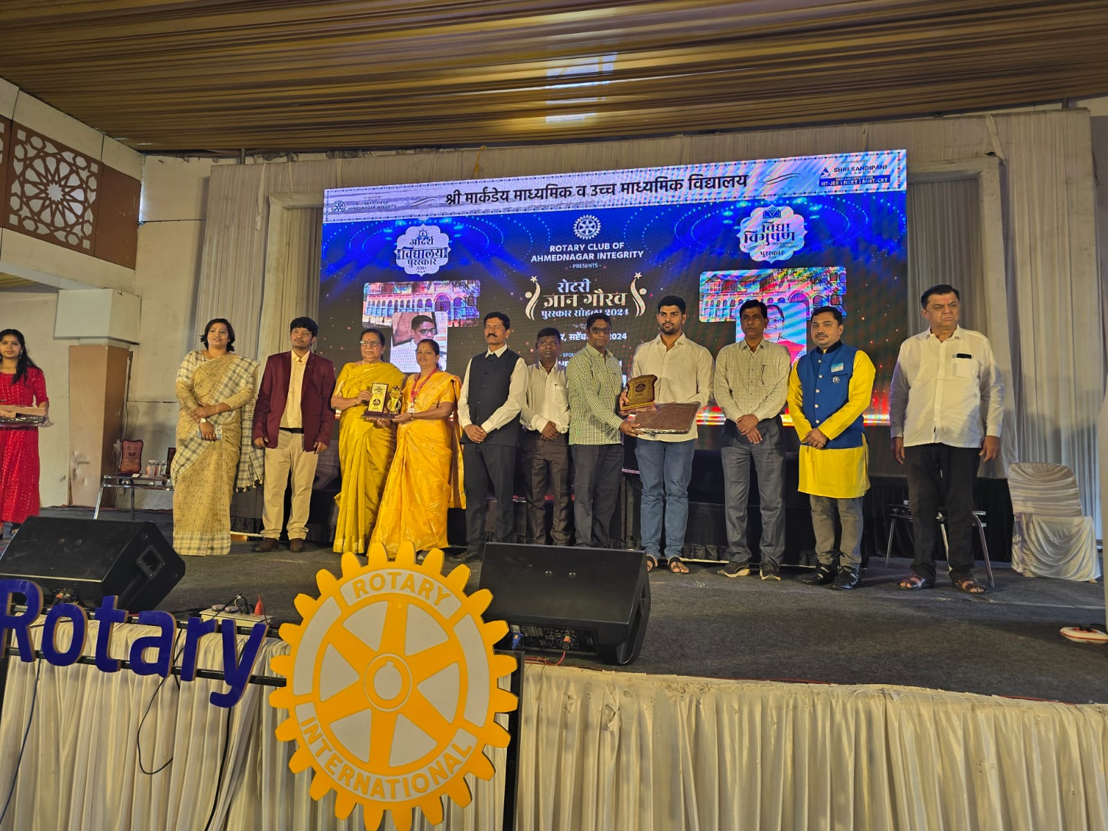 आज दि 8/ 9/2024 रोजी रोटरी क्लब ऑफ अ नगर इंटीग्रीटी यांच्या वतीने श्री मार्कंडेय माध्य व उच्च माध्यमिक विद्यालय गांधी मैदान अ नगर या विद्यालयाला आदर्श विद्यालय पुरस्कार व विद्यालयातील गणित व विज्ञनाच्या ज्येष्ठ अध्यापिका सौ साळुंके मॅडम यांना विद्या विभूषण पुरस्कार देण्यात आला . हा पुरस्कार माजी सहशिक्षण आयुक्त महाराष्ट्र शासन व बोर्डे ऑफ डायरेक्टर रोटरी क्लब चे श्री *दिनकर टेमकर व रयत शिक्षण संकुल श्रीरामपूर च्या चेअरमन श्रीमती मीनाताई जगधने* यांच्या हस्ते व शिक्षणाधिकारी (माध्य ) श्री अशोक कडूस साहेब व शिक्षणाधिकारी ( योजना ) श्री बाळासाहेब बुगे तसेच बी जे पी युवा मोर्चा अध्यक्ष श्री अक्षय कर्डिले यांच्या उपस्थितीत स्वीकारतांना विद्यालयाचे प्राचार्य श्री छिंदम सर व शिक्षिका सौ साळुंके मॅडम . यावेळी रोटरी क्लब ऑफ अ . नगर इंटीग्रिटी चे सर्व पदाधिकारी व सांदीपनी ॲकॅडमी चे डॉ. के. बालराजू सर उपस्थित होते