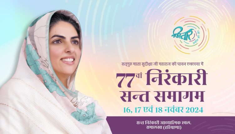 नगर- सदगुरु माता सुदिक्षाजी महाराज व निरंकारी राजपिता रमीतजी यांच्या पावन छत्रछायेखाली निरंकारी मिशनच्या वतीने तीन दिवसीय ७७ वा वार्षिक निरंकारी संत समागमचे भव्य आयोजन आध्यात्मिक स्थळ, समालखा (हरियाणा) येथे दि. १६ ते १८ नोव्हेंबर पर्यंत होणार असून संत समागमाला नगर शहर सह जिल्ह्यातून तसेच अहमदनगर क्षेत्र अंतर्गत येणाऱ्या शाखा बीड, परभणी, हिंगोली, नांदेड, आदी ठिकाणाहून हजारो निरंकारी भक्त उपस्थित राहणार असल्याची माहिती मंडळाचे नगर क्षेत्र प्रमुख हरीश खूबचंदानी यांनी दिली.